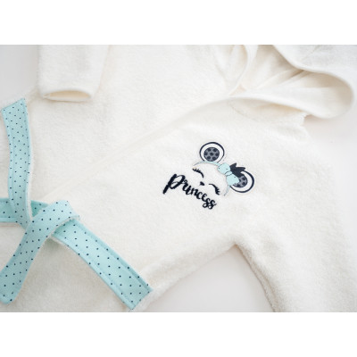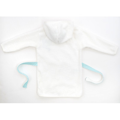 Халатик – чудова, затишна модель з капюшоном, на запАху, під поясок, з довгими вшивними рукавами, прикрашений симпатичною настроченою аплікацією. Пояс вшитий у бічні шви, так що не загубиться при використанні.